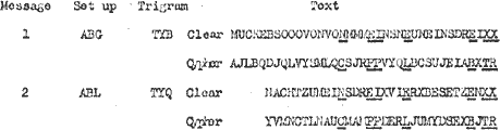 4. Now we will write out the encypherments of the messages - notice (1) the fundamental point that since letters written in the same column are encyphered at the same machine position, repeats in the clear text become repeats in the cypher text (2) that since both set ups are encyphered at the same machine position (i.e. at the grund for the day) repeats in the set up become repeats in the message trigram (Verfahren kenngruppe).