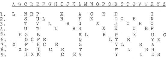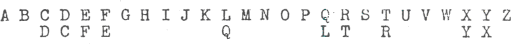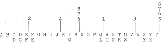 In this alphabet F + 7 = Q and we have a good fit at this distance which was not used in our scritching. We have in fact 'picked up' this extra fit and thereby obtained a considerable factor in favour of this alphabet. We now fit in S in such a position that S + 3 = Y in accordance with our hexagram: