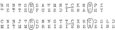 Here we get the repeats - "clicks" we called them - as expected and also 'reciprocals' where the cypher text in one message equals the clear text in the other. Now let us assume that we are cribsters possessing only the cypher text but suspecting that the top message is a weather message which says ‘Wetter fuer die nacht und Morgen' - quite a likely state of